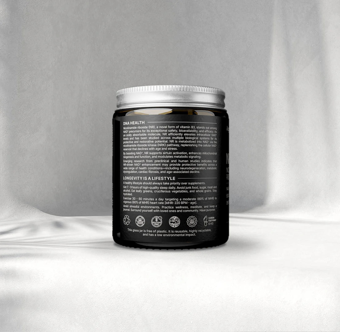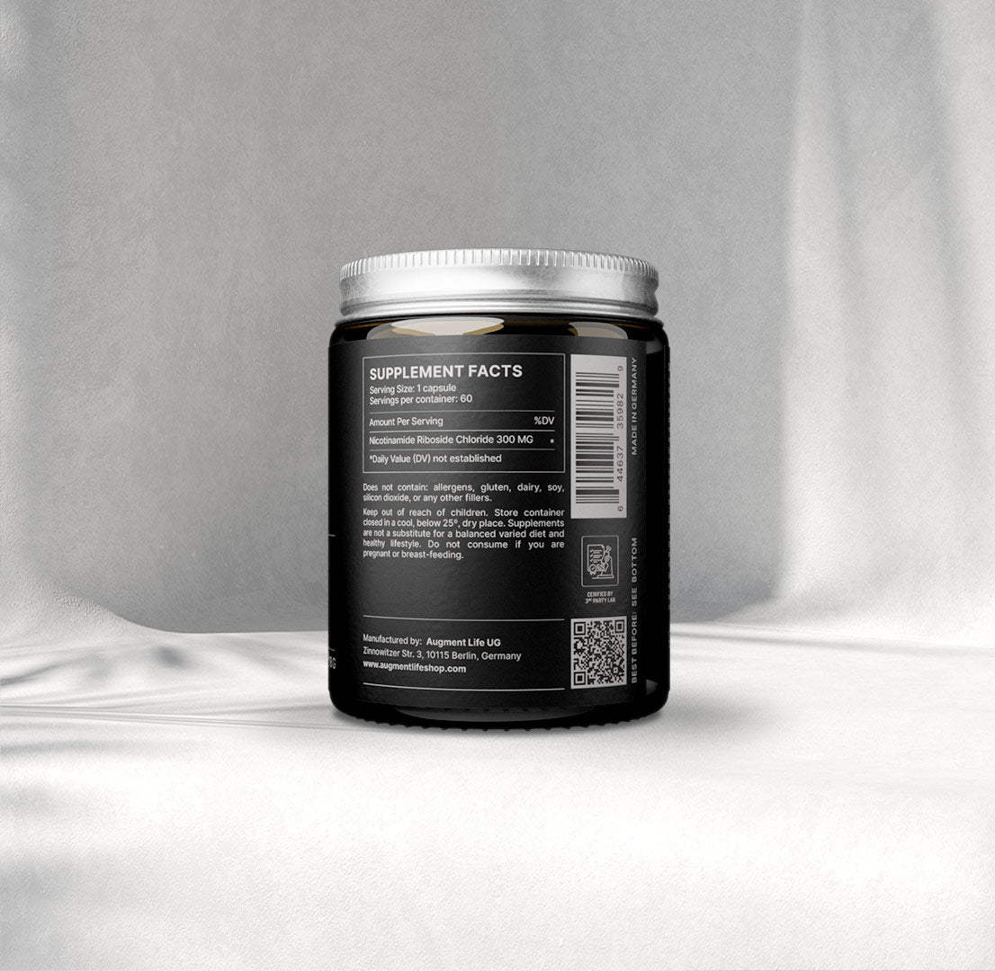 Dette kosttilskud indeholder Nicotinamide Riboside (NR), en syntetisk form af vitamin B3 (niacin). NR er en forbindelse, der findes naturligt i små mængder i visse fødevarer og indgår i kroppens egne biokemiske processer.